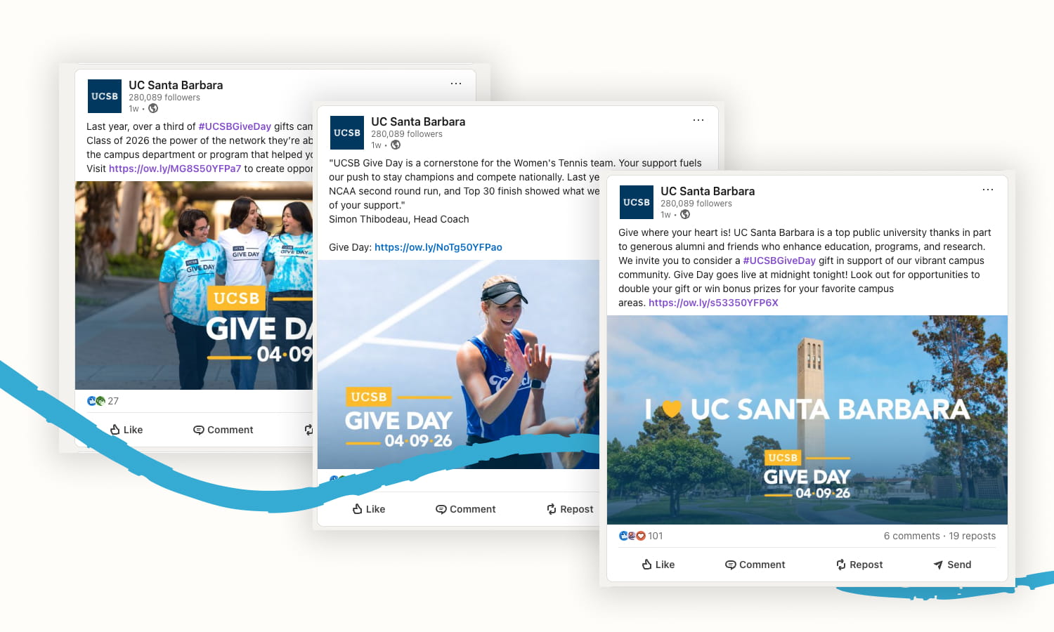 A key focus of this project was building an Ambassador Toolkit: a set of ready-to-use digital assets for UCSB ambassadors to share across their personal social media channels. The goal was to empower our community to spread the word with the hashtag #UCSBGiveDay and drive engagement across Facebook, LinkedIn, and Instagram.